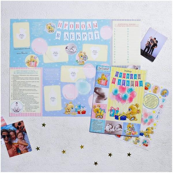 Плакат "Проводы в декрет" для вклейки фото и записи пожеланий будущей мамочке наклейки (№1271322) 1271322"Товары для новорожденных" магазин / опт / розница /маркетплейсЛиквидация магазина! Скидки 50% за наличные!Цена указана с 50% скидкой при покупке за наличные и при предъявлении карточки товара на кассеМагазин точно работает, приходите и выбирайте лично с ПН по ПТ с 10-00 до 18-00; СБ с 11:00 до 17:00Новосибирск, Электрозаводская, 4Покупки в магазине от 1 руб.Доставка по Новосибирску - Яндекс доставка за Ваш счет - оплата за товар перед отправкой.Доставка в другие города - доставка любыми ТК при покупке от 5000 руб, Доставка до ТК 500 руб.*Расцветки в ассортименте. На фото представлен просто пример. Именно этой расцветки может уже не быть.*Наличие именно этой расцветки и этого товара не гарантируем, так как распродажа, много заказов. Остатки обновляем 1 раз в неделю по субботамЭтот плакат поможет красиво проводить будущую маму в самый нежный и трогательный отпуск — декретный! Напишите ей свои добрые и светлые пожелания, душевные и искренние слова, которые своей теплотой будут согревать мамочку в ожидании этого радостного события!В наборе:Папка с местом для записи пожеланий от коллег, анкета будущей мамочки и список необходимых вещей в роддом.Плакат формата А2, где вы разместите фотографии и запишете варианты имени для малыша.Лист с яркими наклейками для украшения плаката.Создайте свой неповторимый календарь беременности!