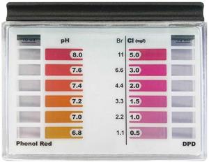 Измерение pH: Есть . Измерение Cl: Есть . Измерение O2: Нет . Измерение Rx: Нет . Измерение Br: Есть . Измерение жесткости: Нет . Измерение щелочности: Нет . Измерение Cu: Нет . Диапазон измерений Br: 1.1-11 мг/л. Диапазон измерений Cl: 0.5-5 мг/л. Диапазон измерений pH: 6.8-8.0 . Описание: Таблеточный тестер Pool-ID от производителя Aquaviva предназначен для определения важных показателей воды плавательных бассейнов. Используется для измерения уровня хлора, pH и брома в воде плавательного бассейна. Инструкция по применению: Необходимо снять верхний колпачок с мензурок и заполнить оба отсека водой из бассейна до черты (воду рекомендуется брать с глубины 20-30 см). Добавить таблетки в необходимые отсеки мензурки. Далее следует закрыть мензурки колпачком и интенсивно взболтать до равномерного окрашивания полученных растворов. В результате взбалтывания вода окраситься в зависимости от уровня pH, концентрации хлора и брома. Для определения значений необходимо сравнить цвета полученные в каждой мензурке с соответствующими цветовыми шкалами.